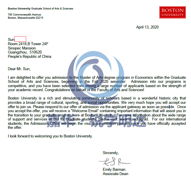 从最终的申请结果来看,也确实验证了我们前期定位的正确性。我们成功获得了美国综合排名42的波士顿大学的经济学硕士专业。