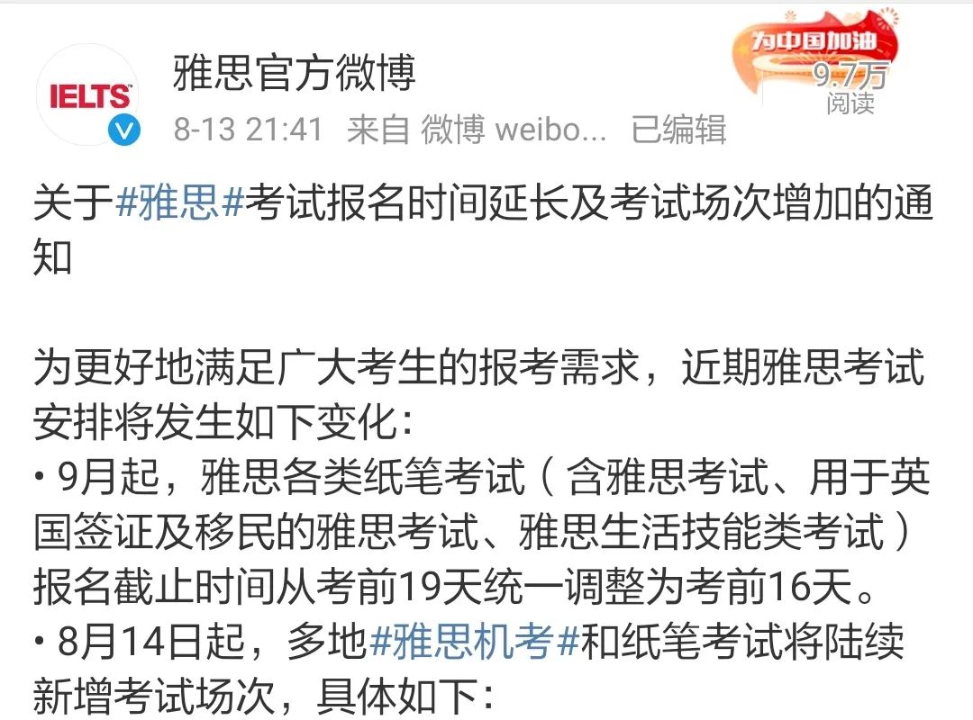 2021年8月13日,雅思官方发布了《关于雅思考试报名时间延长及考试场次增加的通知》。
