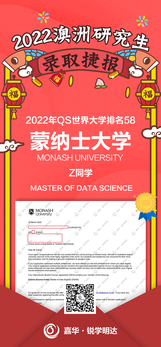 【导读】Z同学成功获录澳洲蒙纳士大学,锐学明达恭喜Z同学喜获心仪院校offer!