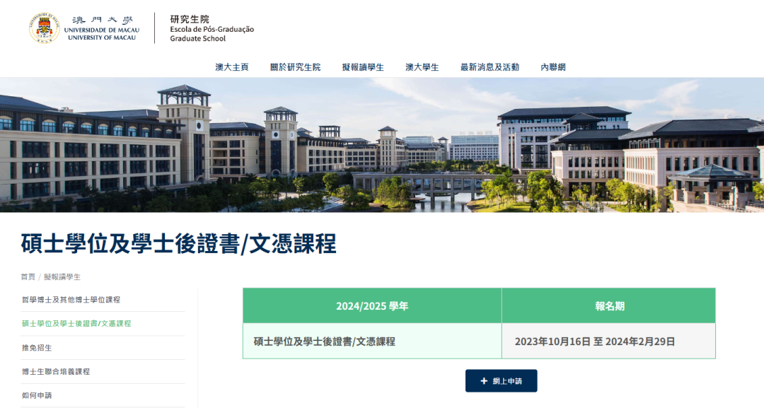 澳门大学2024年秋季入学硕士申请的时间为2023年10月16日~2024年2月29日,感兴趣的小伙伴们需抓紧时间规划申请。
