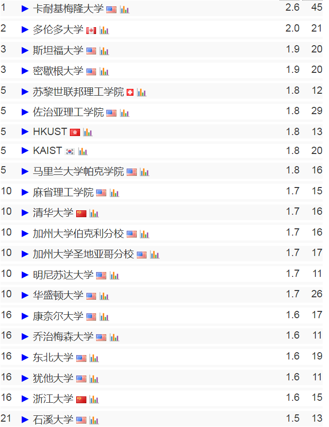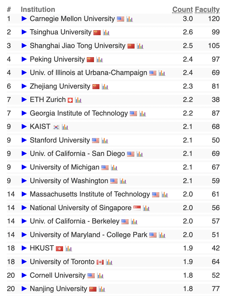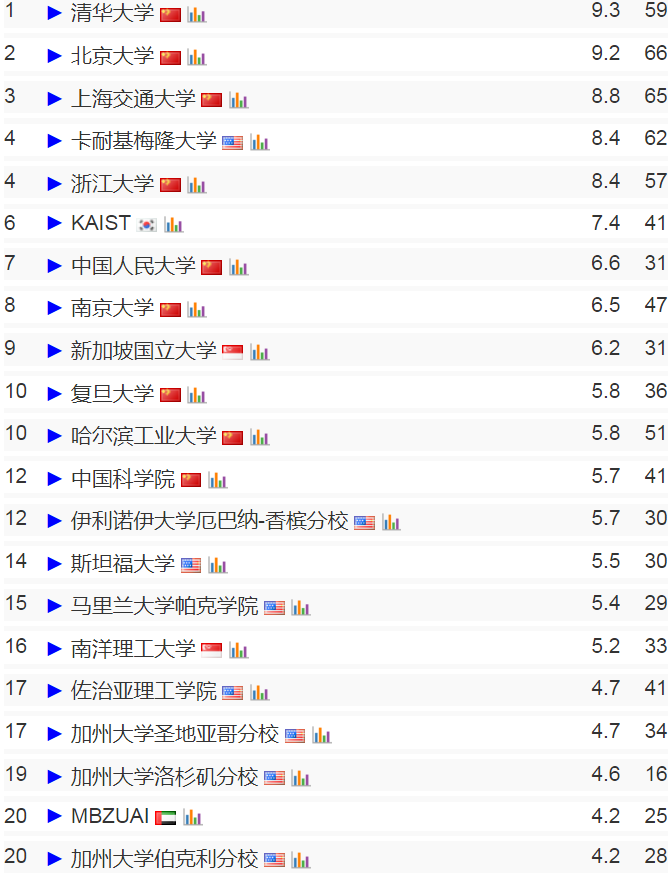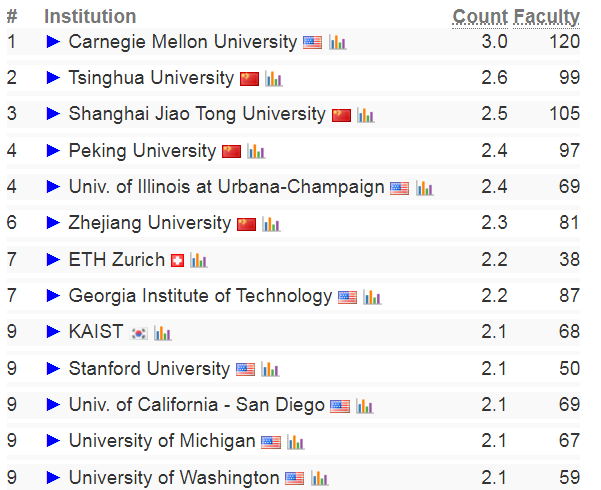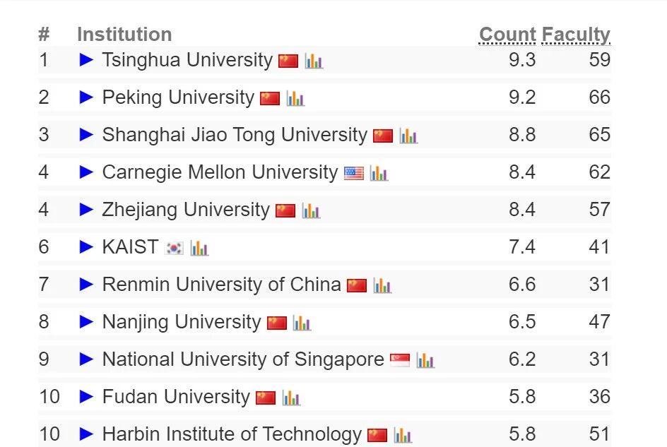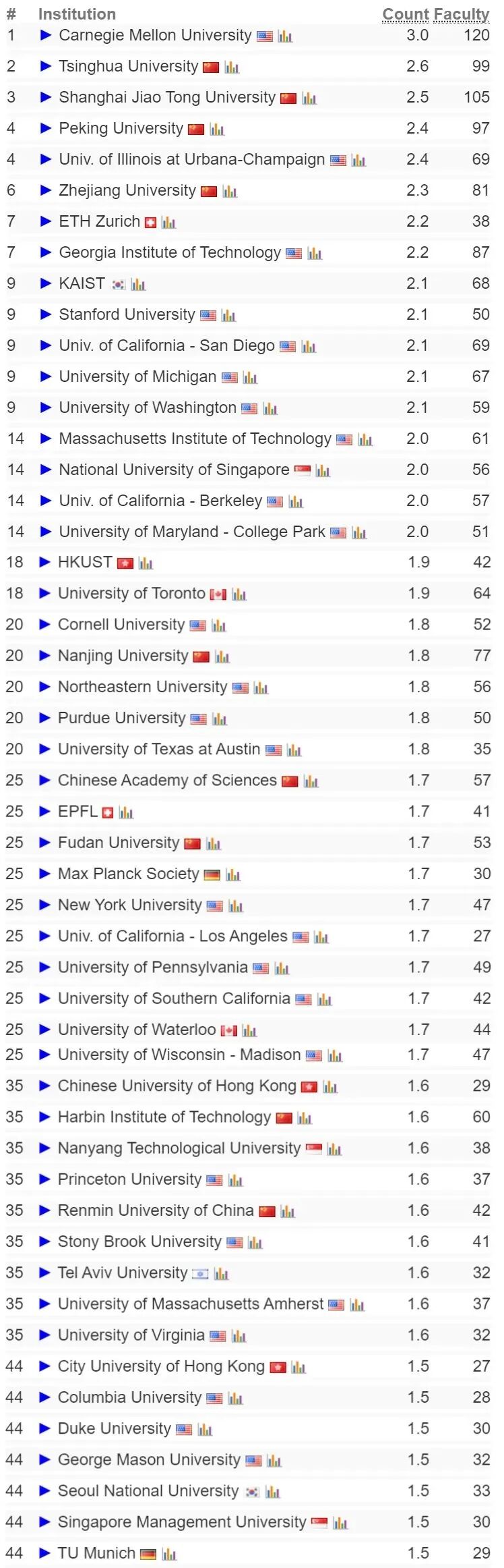 除中国院校外,美国的卡耐基梅隆大学、韩国KAIST科学技术学院、新加坡国立大学也位列Top10。