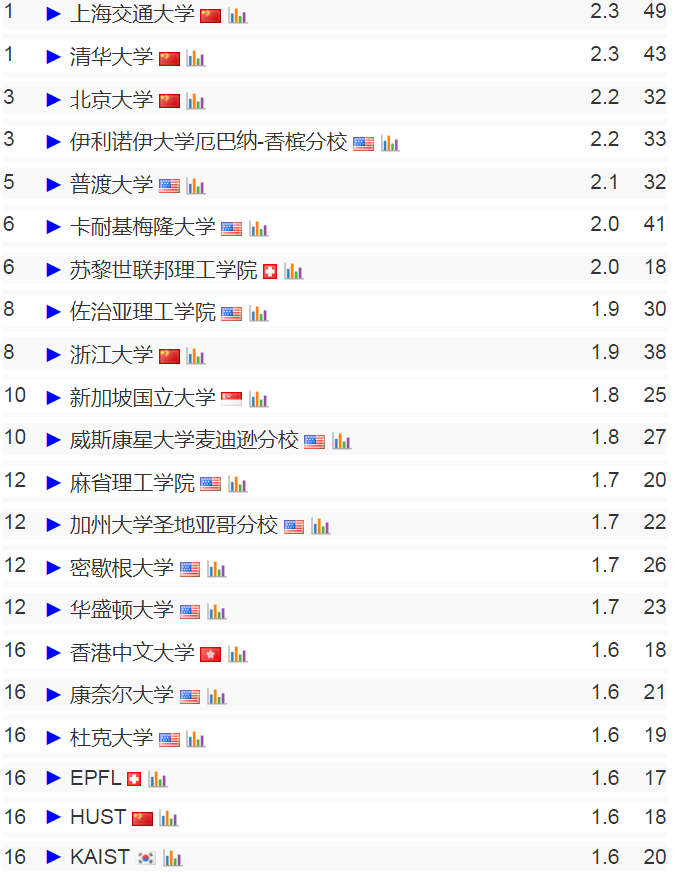 当然,不少中国高校也榜上有名,清华第二,上交第三,北大第四。