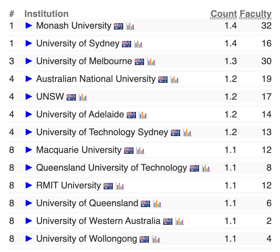 澳大利亚共有3所大学进入世界TOP100:蒙纳士大学(#54)、悉尼大学(#54)、墨尔本大学(#83)。