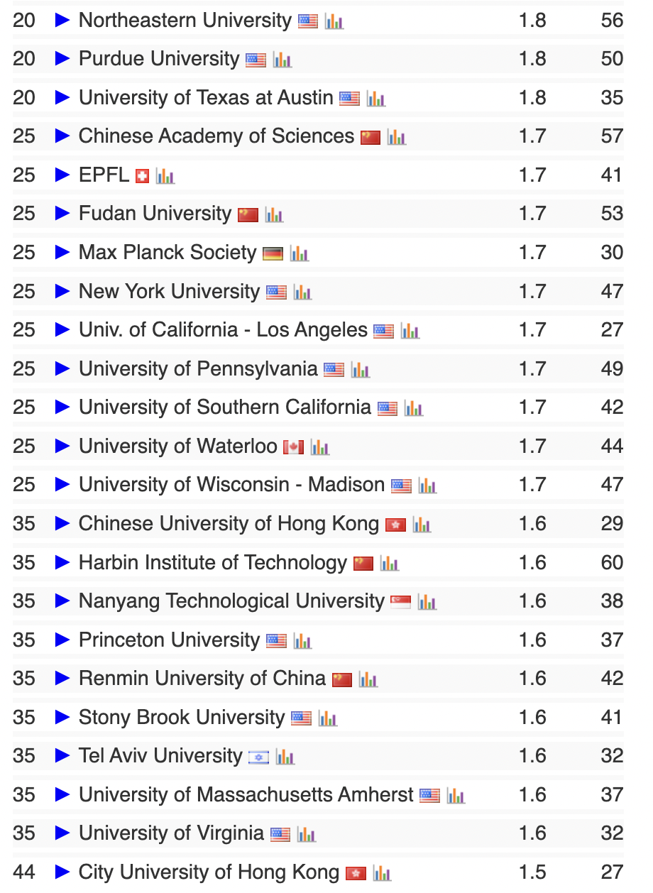 清华大学(2)、上海交通大学(3)、北京大学(4)、浙江大学(6)、香港科技大学(18)、南京大学(20)、中国科学院(25)、复旦大学(25)、香港中文大学(35)、哈尔滨工业大学(35)、中国人民大学(35)、香港城市大学(44)。