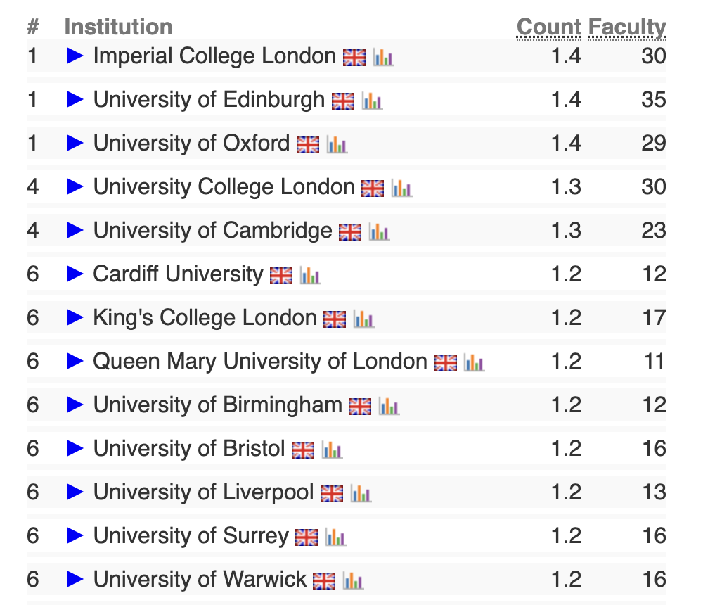 本次英国大学在排名中的表现就有些不是很理想,前50无一所上榜。帝国理工学院、爱丁堡大学、牛津大学并列世界第54、全英第1。