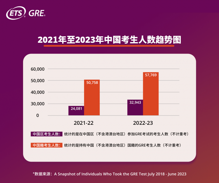 其中,随着全球高校加强GRE成绩要求,越来越多的中国学生考GRE申请研究生项目,所以,数据显示,2023年参加GRE考试的中国籍考生共57769名,考生人数比上一年度增长36.8%,仅次于美国和印度,位列全球第三。