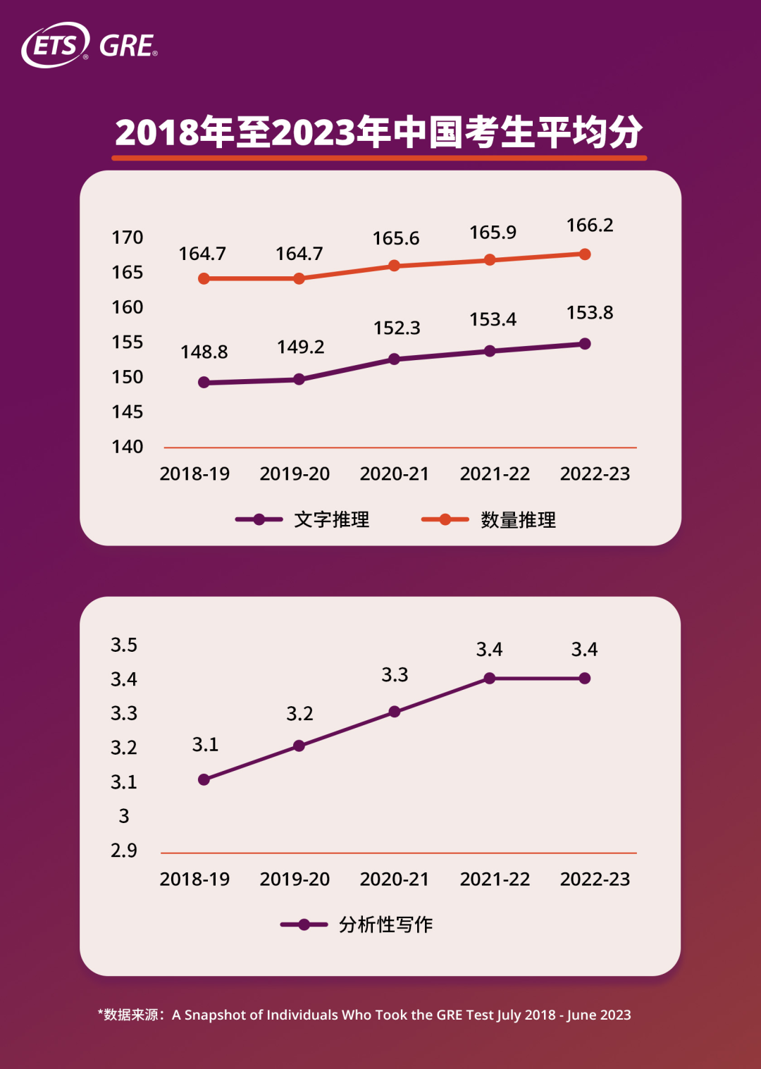 相比上一个考试年度,2022-23年度中国籍考生(不含港澳台地区)在数量推理和文字推理两个部分的表现依然节节攀高,均分相应提升0.3分和0.4分;分析性写作部分均分稳定在3.4,与去年持平。