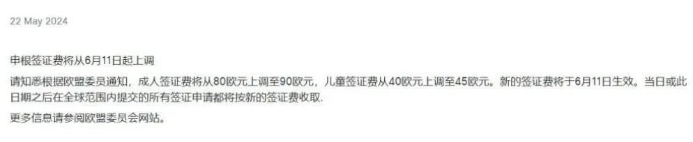 根据欧盟委员通知:成人签证费将从80欧元上调至90欧元,儿童签证费从40欧元上调至45欧元。新的签证费将于6月11日生效。当日或此日期之后在全球范围内提交的所有签证申请都将按新的签证费收取更多信息请参阅欧盟委员会网站。
