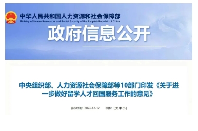 12月12日,中央组织部、人力资源社会保障部等10部门印发《关于进一步做好留学人才回国服务工作的意见》的通知。具体如下: