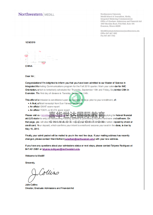 在文书中,老师重点突出了赵同学的学习能力、领导力和创业过程中对市场营销知识的运用和需求;文案老师对学生的面试也很上心,反复培训力求完美。最后的结果非常好,递交的四所学生最想去的院校都斩获offer并获得总额5万7千美金的奖学金。最后学生如愿以偿,入读全美排名第一的西北大学整合传播营销专业。